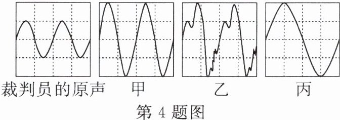 4.(声波)学校正在开运动会。裁判员正拿着扩音器指挥现场,裁判员的声音通过扩音后的声波波形图是图中的______;甲、乙、丙中音调相同的是______两图。