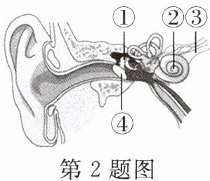 2.(耳的结构)你能够听到下课铃声,是因为声波引起④______的振动,带动了听小骨,刺激了②______内的听觉感受器,并最终在______产生了听觉。