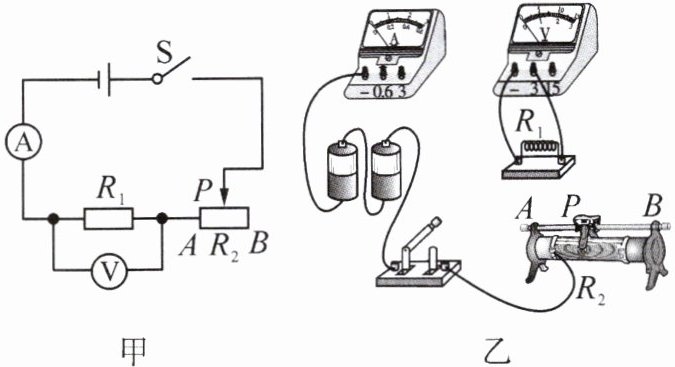 (5)实验中,他们将 10 欧的定值电阻换成 20 欧的定值电阻后,观察______,同时应将滑动变阻器R_2的滑片 P 向______(填“A”或“B”)端移动到适当位置。