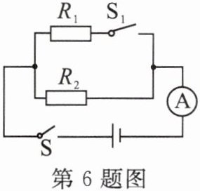 6. 如图所示,电源电压保持不变,只闭合开关$S$时,电流表的示数为0.2安;若再闭合开关$S_1$,发现电流表的示数为0.5安,此时通过$R_1的电流为I_1$,通过$R_2的电流为I_2$,则( )
