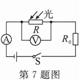 7. 将光敏电阻$R$、定值电阻$R_0$、电流表、电压表、开关和电源连接成如图所示电路。光敏电阻的阻值随光照强度的增大而减小。闭合开关,逐渐增大光敏电阻的光照强度,观察电表示数的变化情况应该是………………( )