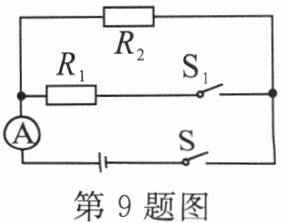 9. 如图所示的电路中,电源电压恒定,$R_2= 10$欧,开关$S$、$S_1$都闭合时,电流表示数为0.4安;开关$S$闭合、$S_1$断开时,电流表示数变为0.3安。则电源电压为______伏,电阻$R_1$的阻值为______欧。