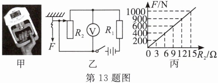 13.(7分)某学习小组同学想制作如图甲所示的简易握力计,选用电压表来显示握力的大小。他们设计的电路原理图如图乙,其中电源电压3伏,定值电阻$R_1$阻值为6欧,电压表量程为0~3伏,轻质细杆将弹簧与滑动变阻器$R_2$的滑片相连。