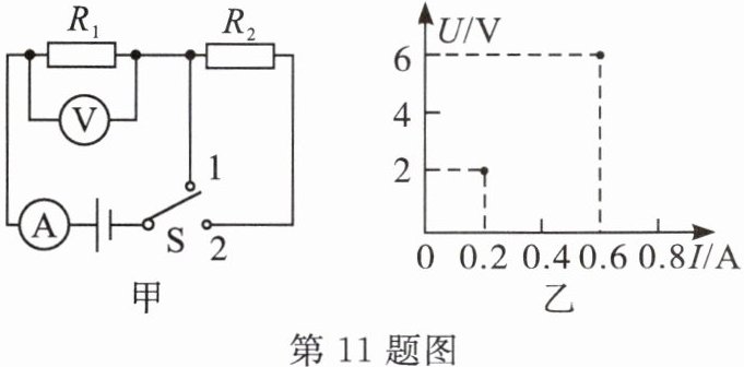11. 如图甲,当开关$S$从2转到1时,根据电流表和电压表对应的示数,$U—I$坐标系中描绘了相对应的点,如图乙,则电源电压为______伏,$R_1$的阻值为______欧,$R_2$的阻值为______欧。