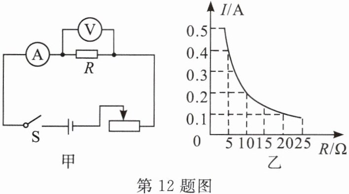 (2)实验中依次接入三个定值电阻,记下电流表的示数,得到如图乙所示的电流$I随电阻R$变化的图象,由图象可以得出结论:______。