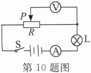 10. 如图所示的电路,将滑动变阻器滑片$P$移到最左端,闭合开关$S$,若将滑片$P$向右移动,则电路的总电阻______,电压表示数______,电流表示数______。(均填“变大”“变小”或“不变”)