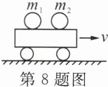 8.如图所示,在一辆表面光滑的小车上,放有质量分别为$m_1、$$m_2$的两个小球,随车一起做匀速直线运动。当车突然停止运动,则两小球(设车无限长,其他阻力不计) ………( )