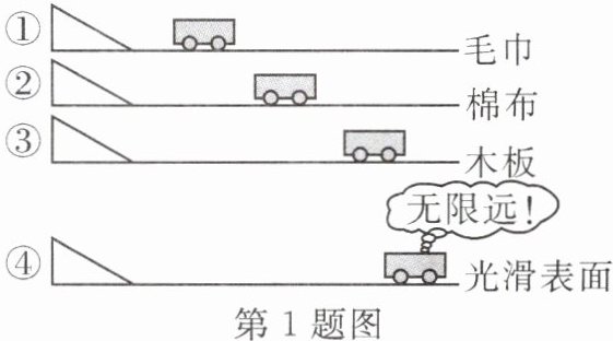 1.“牛顿第一定律”的形成,经历了伽利略、笛卡尔和牛顿等科学家不断完善的过程。如图是某同学探究“牛顿第一定律”的方案。根据图中情景可以判断下列说法正确的是 …………( )