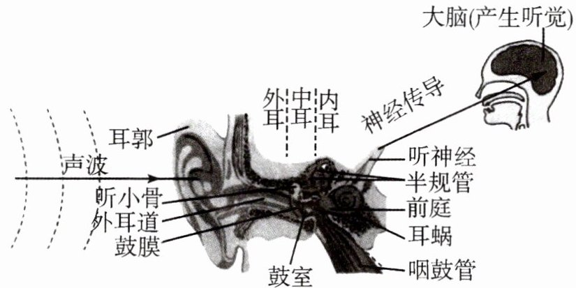 (3)听觉的形成:声源振动→介质传播→ 鼓膜 振动→ 听小骨 → 耳蜗 →听神经→大脑。