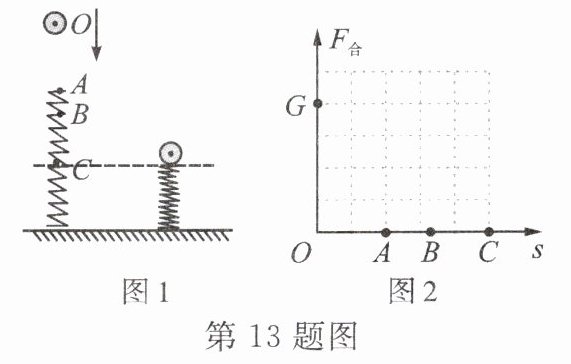 13. 如图 1 所示,将轻质弹簧的一端固定在水平桌面上,在弹簧正上方 O 点释放一个重为 G 的金属小球,下落到 A 点时与弹簧接触并压缩弹簧至 C 点(B 点时二力平衡),随即被弹簧竖直弹出。请在图 2 坐标系中画出小球从 O 点下落直至 C 点的过程中,其所受合力的大小随运动距离变化的大致关系图像。