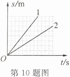 10. 用弹簧测力计沿竖直方向两次拉动重为 G 的物体,两次运动的 s-t 图像如图所示,对应的弹簧测力计示数和速度分别为$F_1$、$v_1和F_2$、$v_2$,则$v_1$ $v_2$,$F_1$ $F_2$。(均填“>”“<”或“=”)