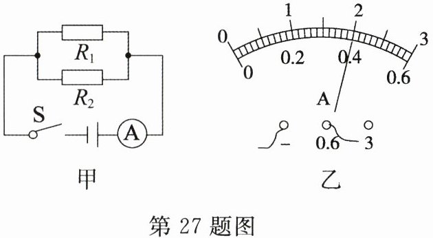 27. 如图甲所示电路,电源电压不变,$R_1$、$R_2$是定值电阻,$R_1= 10$欧。闭合开关S,电流表示数如图乙所示,当$R_1$由于某种原因断路时,电流表的示数变为0.10安。请回答下列问题。