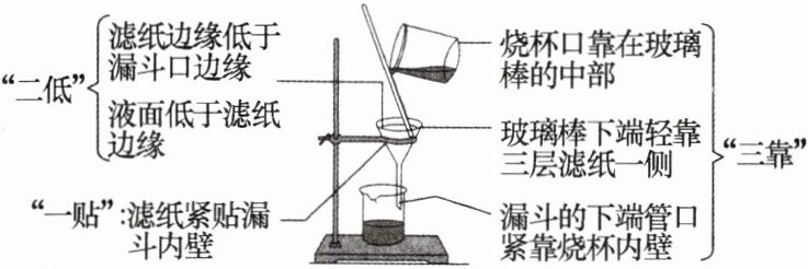 ②过滤时,做到“ 一贴、二低、三靠 ”。一贴: 滤纸 紧贴 漏斗 内壁,不要留有气泡。二低:漏斗内 滤纸 边缘低于 漏斗口 边缘;漏斗内 液面 低于 滤纸 边缘。三靠:倾倒液体时, 烧杯 与 玻璃棒 接触(用玻璃棒 引流 ); 玻璃棒 末端与漏斗内 三层滤纸处 接触; 漏斗下端 与承接滤液的 烧杯内壁 接触。