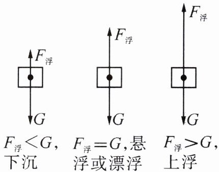 ①当 $\rho_{液}>\rho_{物}$ 时,物体 上浮 ;②当 $\rho_{液}<\rho_{物}$ 时,物体 下沉 ;③当 $\rho_{液}= \rho_{物}$ 时,物体能保持 悬浮 。(注: 漂浮 物体的 $\rho_{物}<\rho_{液}$)