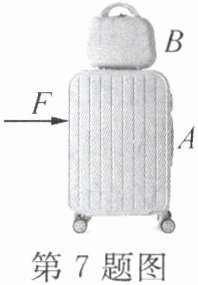 7. 如图所示,用水平力F推行李箱,此时行李箱上的小包和行李箱一起水平向右做匀速直线运动,空气阻力忽略不计,下列说法正确的是 …………………………………………………( )
