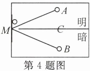 4. 如图所示,相邻两室,一明一暗,在两屋之间的墙壁上有一平面镜M,且$\angle AOC= \angle BOC,$甲、乙两人分别站在A、B两点,向平面镜张望,则 …………………………………( )