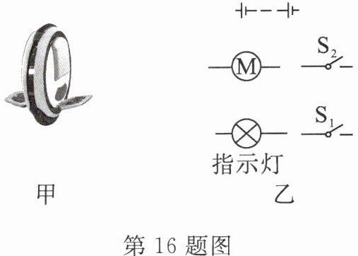 16.如图甲是某品牌的单轮平衡车,它是依靠电力驱动及人体平衡能力控制的代步工具。为了确保安全,该单轮平衡车的电路部分安装2个开关——电源开关$S_1$和压力开关$S_2,$当手动闭合$S_1$时,指示灯亮起;此时骑行者再站立于平衡车踏板上后$S_2$自动闭合,电动机才能正常启动,平衡车才开始运动。未闭合$S_1$或骑行者未站立于踏板上,电动机都无法启动。请根据上述要求,用笔画线将图乙电路图连接完整。