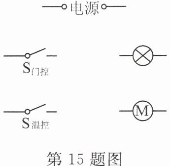 15.电冰箱的压缩机(电动机)是由温控开关控制的,冷藏室中的照明灯是由门控开关控制的,即开冰箱门时照明灯亮、关冰箱门时照明灯灭。请在图中用笔画线连接符合上述要求的电冰箱工作电路图。