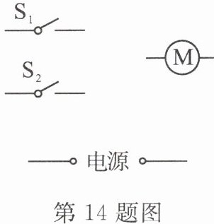 14.指纹锁是目前应用比较广泛的智能锁具,通过“指纹”开关$S_1$或“密码”开关$S_2$都能启动电动机M运转,打开门锁。请用笔画线将图中的各元件连接成符合上述设计要求的电路图。