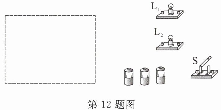 12.在虚线框内画出电池组电源、小灯泡$L_1$和$L_2$并联、S为干路开关的电路图,并在图中连接实物图。