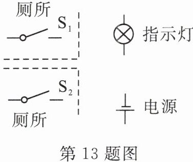 13.小满暑假坐火车去北京,在火车上发现车厢后面有两个厕所,只有当两个厕所的门都关上时,车厢指示灯才会发光,指示牌才会显示“厕所有人”字样,提醒顾客两个厕所内都有人,请用笔画线将图中各元件连接成符合上述设计要求的电路图。