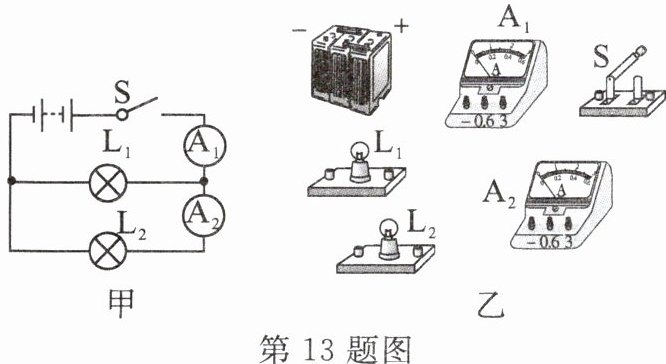 13. 在图甲中,闭合开关后,通过灯$L_1$的电流为0.5A,通过灯$L_2$的电流为0.4A。请根据图甲的电路图将图乙中的实物用笔画线代替导线连接起来。