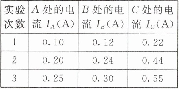 | 实验次数 | A处的电流Iₐ(A) | B处的电流Iᵦ(A) | C处的电流Ic(A) |