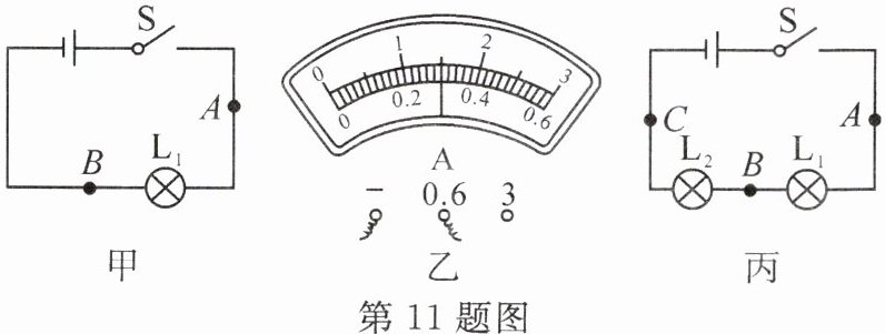 (2)连接电路,用电流表测出A点电流,如图乙所示,则Iₐ= ______A,再测出B点电流,得到A、B两点电流相等。更换不同规格的灯泡,重复上述实验,都得到相同结论。由此判断猜想是______的。