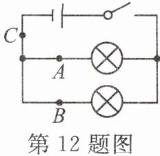 12. 小科按照课本要求探究并联电路中电流的关系,他们设计的电路如图所示。将电流表分别接入到电路中的A、B、C处,测出它们的电流,如表所示。