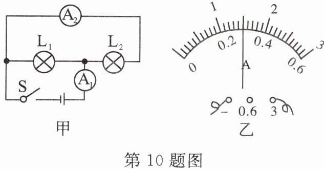 10. 如图甲电路,闭合开关S后,两个灯泡都能发光,图乙为电流表$A_1$指针的位置,电流表$A_2$示数是0.5A,请回答下列问题。