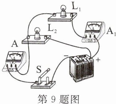9. 如图所示$,A_1$测______的电流,A测______的电流;若$A_1$的示数是0.8A,A的示数是1.9A,则通过灯泡$L_2$的电流$I_2= ______A。$