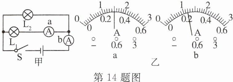 14. 如图甲所示电路,当开关S闭合后,电流表的指针偏转如图乙所示,其中电流表a测量的是通过______(填“电源$”“L_1”$或$“L_2”)$的电流,电流表b的示数应为______A,通过$L_2$的电流为______A。