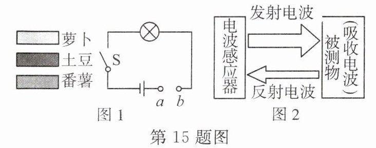 15. 小明为了比较萝卜、土豆、番薯的导电能力,将它们切成大小相同的长条,接在如图 1 电路 a、b 间。