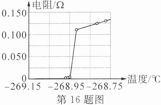 16. 科学研究发现某种金属电阻与温度的关系如图所示。描述该金属电阻在降温过程中的现象:______。探索新材料是高科技研究领域中永恒的主题之一,若常温下某种新材料的电阻为零,则该新材料可用于制造______(写出一种),以减少能量损耗。