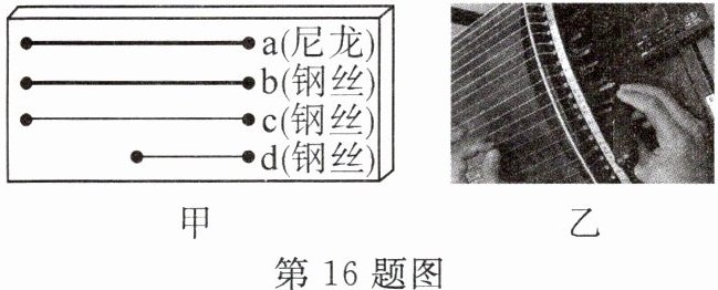 16. 古筝是中国独特的民族乐器之一,已经有2500年的历史了,目前最常用的规格为二十一弦。小红在古筝演奏中发现,拨动不同琴弦发出的音调与弦线的长度、粗细和松紧程度有关。于是她利用弦音计(如图甲)做研究,弦音计上有四根固定在“音箱”上的琴弦,每根弦线的松紧程度都相同,她选用的琴弦长度、粗细、材料在图中已标出。