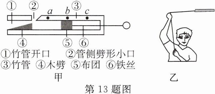 13. 如图所示,图甲是小明在课余时间制作的一个竹笛,在竹管开口处①向管内吹气时,竹笛可以发出美妙的笛声,推拉铁丝环时,音调可以改变,吹奏歌曲。请回答下列问题。