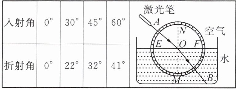 16. 小怡利用如图所示的实验装置探究光的折射。在玻璃水槽中竖直放置的光屏是由E和F两个半圆形光屏组成的,NOM为两个半圆形光屏的分界线,其中光屏F可绕直径NOM前后折转。实验测量数据如表所示。