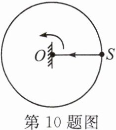 10. 如图所示,一平面镜放在圆筒的中心处,平面镜正对筒壁上一点光源S,点光源发出一细光束垂直射向平面镜。平面镜从图示位置开始绕圆筒中心轴O匀速转动,在转动$30^\circ$角时,点光源在镜中所成的像转过的角度$\theta_1= ______,照射到筒壁上的反射光斑转过的角度\theta_2= ______。$