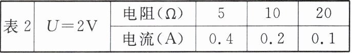 | 表2 | $U= 2V$ | 电阻($\Omega$) | 5 | 10 | 20 |