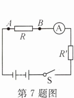 7.小丽用如图所示的电路研究导体中的电流与导体电阻的关系,她先后将$5\Omega$、$15\Omega和20\Omega$的定值电阻接入电路A、B两点间,闭合开关S,读出电流表示数如表所示。由实验数据可以看出电流与电阻并不成反比。