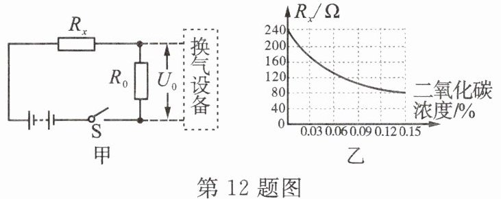 12. 教室不通风会导致室内二氧化碳浓度上升,从而影响学习效率。同学们制定了如下评价量表,并结合该量表设计了一款自动换气设备,其部分结构原理如图甲所示:电源电压为6V,气敏电阻$R_{x}$感知教室二氧化碳浓度的变化;气敏电阻的阻值随二氧化碳浓度的变化如图乙所示;$R_{0}$为定值电阻,当其两端电压$U_{0}≥4V$时,换气设备启动工作,加速室内外气体交换。
