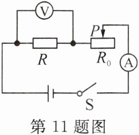 11. 小科用阻值为5Ω、10Ω、20Ω的三个定值电阻 R 探究电流与电阻关系,电源电压为6V且保持不变。若研究过程中保持电阻 R 两端的电压为2V不变,则滑动变阻器$R_{0}$的最大阻值至少要多大?