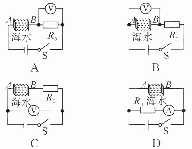 5. 海水盐浓度越大,其导电性越好,固定间距金属片A、B之间海水的电阻越小。下列电路中,电源电压恒定,R₀为定值电阻,闭合开关S,海水盐浓度越大,电表示数越大的是 ……( )