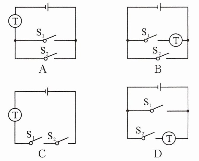 1. 取件人从智能快递柜取件时,可以通过手机扫码(相当于只闭合开关$S_1),$也可以通过输入密码(相当于只闭合开关$S_2)$使装置T启动打开柜门。下列电路图符合上述要求的是( )