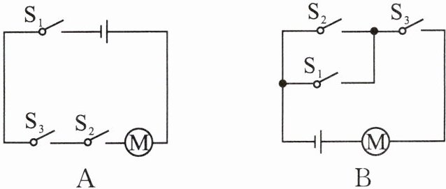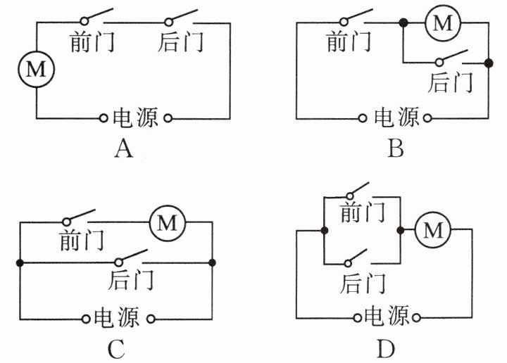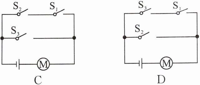 2. 新能源电动汽车的动力来源于电动机。它的设计充分考虑了人身安全,前、后两门(电路开关)中任意一个门没有关闭好,车都无法行驶。下列电路符合要求的是 ………………… ( )