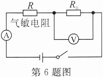 6. 如图所示为小科设计的天然气泄漏检测电路,电源电压恒定不变,R₀为定值电阻,R为气敏电阻。R的阻值随天然气浓度的增大而减小,则天然气 ………………… ( )