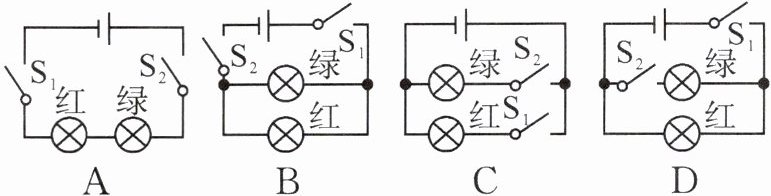 4. 停车场“车位占用”提醒电路,要求车位被占用时,该车位上方只有红色指示灯亮;车位未被占用时,上方只有绿色指示灯亮。下列电路能实现上述要求的是 ………………… ( )
