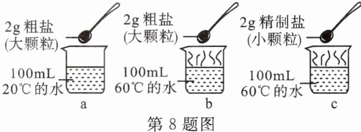 8. 在配制食盐溶液时,同学们发现精制盐比粗盐溶解得更快。阅读配料表发现,这两种食盐的成分相同,只是精制盐颗粒与粗盐相比较小。同学们猜测食盐溶解快慢与其颗粒大小有关,为验证假设,准备了如下实验装置。
