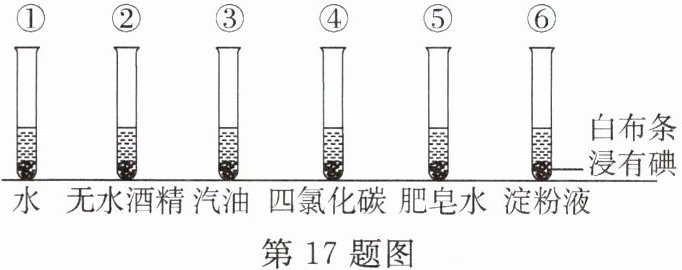 17. 小明陪妈妈到医院输液,不小心将护士手中的盘子打翻,碘酒洒在了小明的白衬衣上,白衬衣上立即出现了一大块紫黑色的痕迹。为找到去除白衬衣上的痕迹的最好方法,小明与几位同学进行了探究,提出了下列几个方案并进行实验:①用水洗;②用无水酒精洗;③用汽油洗;④用四氯化碳洗;⑤用肥皂水洗;⑥用淀粉液洗。