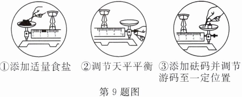 ①添加适量食盐 ②调节天平平衡 ③添加砝码并调节游码至一定位置